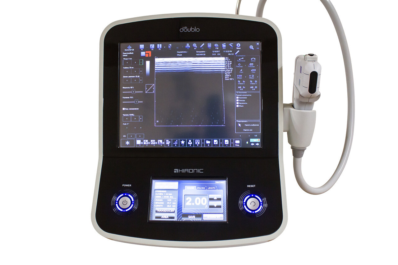 - Полная безопасность процедуры благодаря ультразвуковой диагностике высокого разрешения врач подбирает самый эффективный и безопасный протокол лечения еще до начала процедуры (выполняя УЗИ). В отличие от аналогов аппарат Doublo имеет такую функцию. Это позволяет определить глубину залегания SMAS, наличие введенных ранее препаратов/имплантов, что минимализирует риск осложнений;